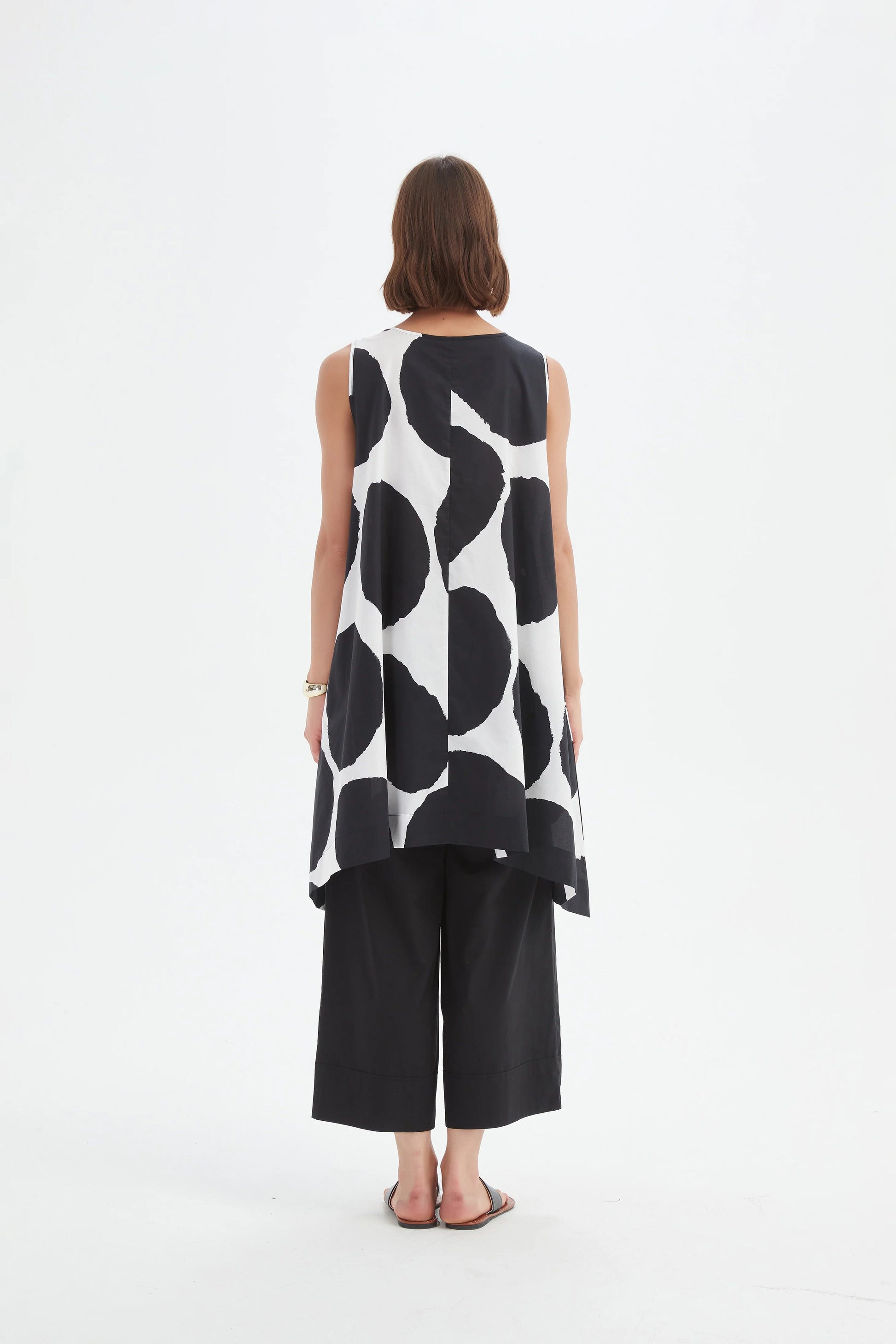 The Sleeveless Poplin Print Top is a vibrant everyday essential with a modern edge. Crafted from crisp, lightweight poplin, it features a flattering sleeveless cut and bold print for effortless style.Pair it with skirts or trousers to effortlessly add pattern and personality to your wardrobe.