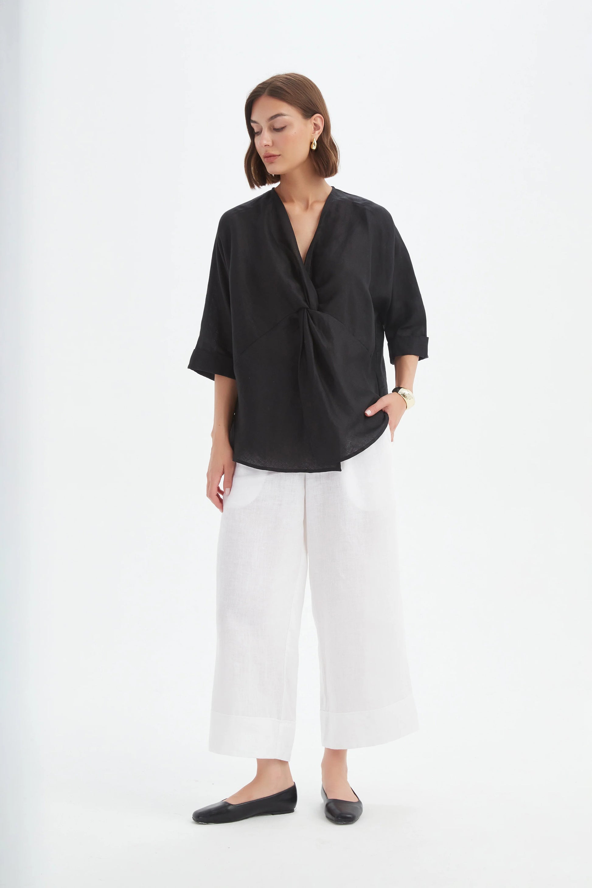 Effortless elegance meets subtle detail in the Twist Front Top. Crafted from 100% French linen, this top features a flattering v-neckline, 3/4 sleeves, and a chic twist-front detail that adds modern shape to its relaxed silhouette. Perfect for pairing with tailored pants, skirts, or jeans, it offers refined, versatile style for sunlit days and polished everyday dressing.